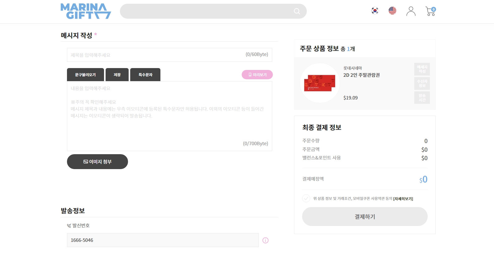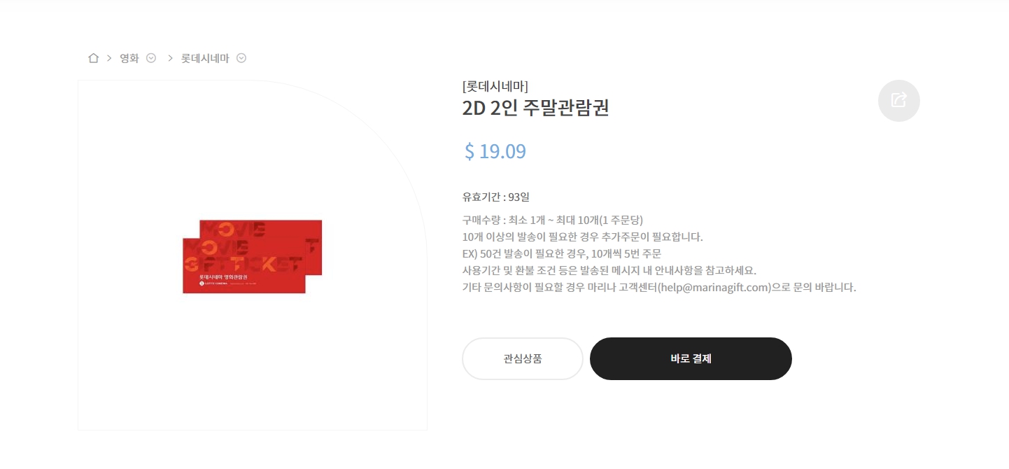 미국에서 한국으로 선물하기로 결정된 제품을 골랐다면 이제 결제로 들어가면 되는데요, 저 같은 경우는 이번에 친구 생일이라 적당한 제품을 둘러보다 영화관람권으로 결정했습니다. 결제시스템의 경우도 달러결제 시스템으로 설계된 플랫폼인지라 해외에서 오래 거주하신 분들이 이해하기도 쉽고 따로 환전을 하는 번거로움이 없는게 좋더라구요. 또 한국어와 영어버전 모두를 지원하기 때문에 외국 친구들도 사용하기 편리해보였어요.